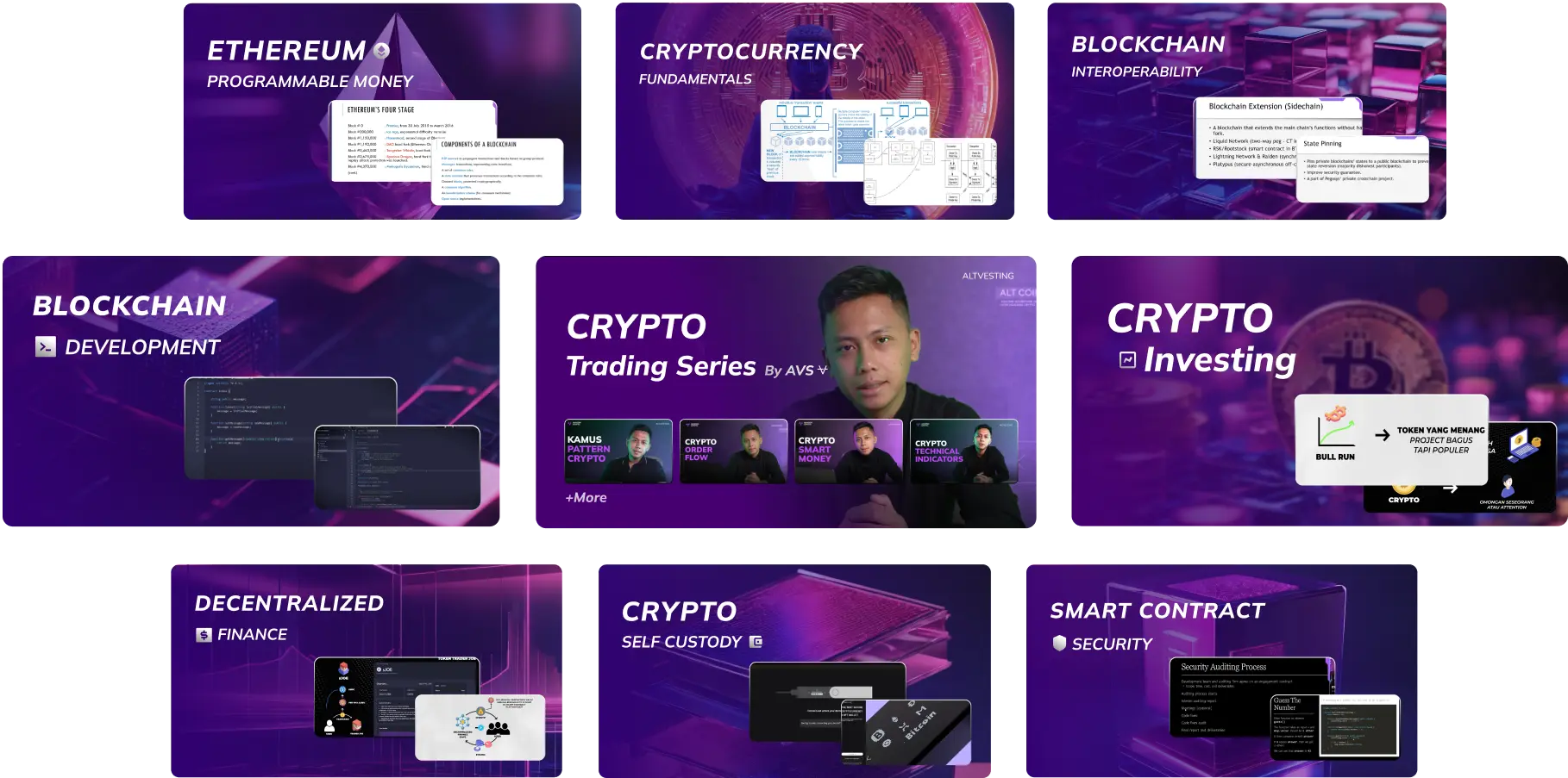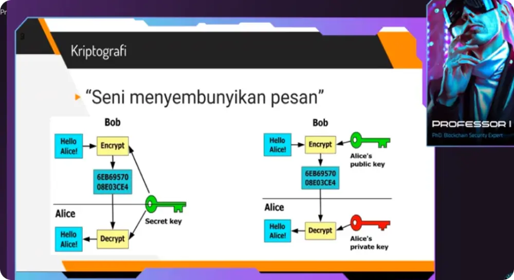 pemanfaatan blockchain, cara menyimpan crypto dengan aman, teknik kriptografi, blockchain interoperability, dan blockchain development sampai bisa programming untuk bikin smart contract/crypto kalian sendiri.